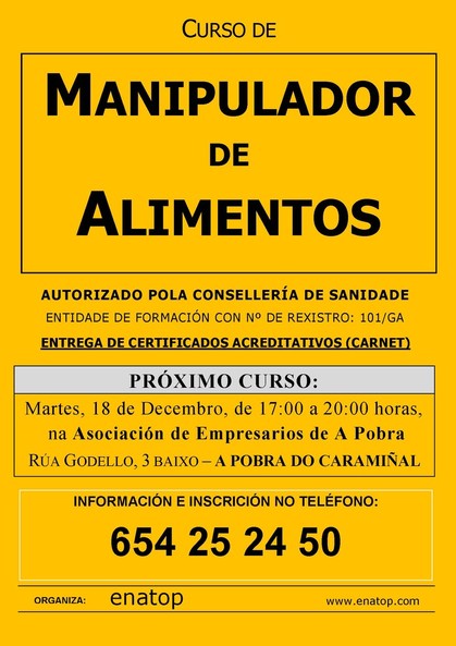Curso de manipulador de alimentos en A Pobra do Caramiñal: martes, 18 de decembro, de 17:00 a 20:00, na Asociación de Empresarios. Curso de manipulador de alimentos en A Pobra do Caramiñal: martes, 18 de decembro, de 17:00 a 20:00, na Asociación de Empresarios.
