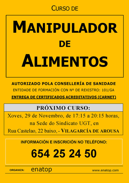 Curso de manipulador de alimentos en Vilagarcía de Arousa: Xoves, 29 de novembro, pola tarde, de 17:15 a 20:15, na sede de UGT. Curso de manipulador de alimentos en Vilagarcía de Arousa: Xoves, 29 de novembro, pola tarde, de 17:15 a 20:15, na sede de UGT.