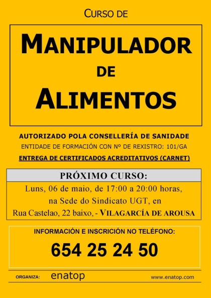Curso de manipulador de alimentos en Villagarcía de Arosa: lunes, 06 de mayo, de 17:00 a 20:00, en la sede del sindicato UGT. Curso de manipulador de alimentos en Vilagarcía de Arousa: luns, 06 de maio, de 17:00 a 20:00, na Sede do Sindicato UGT.